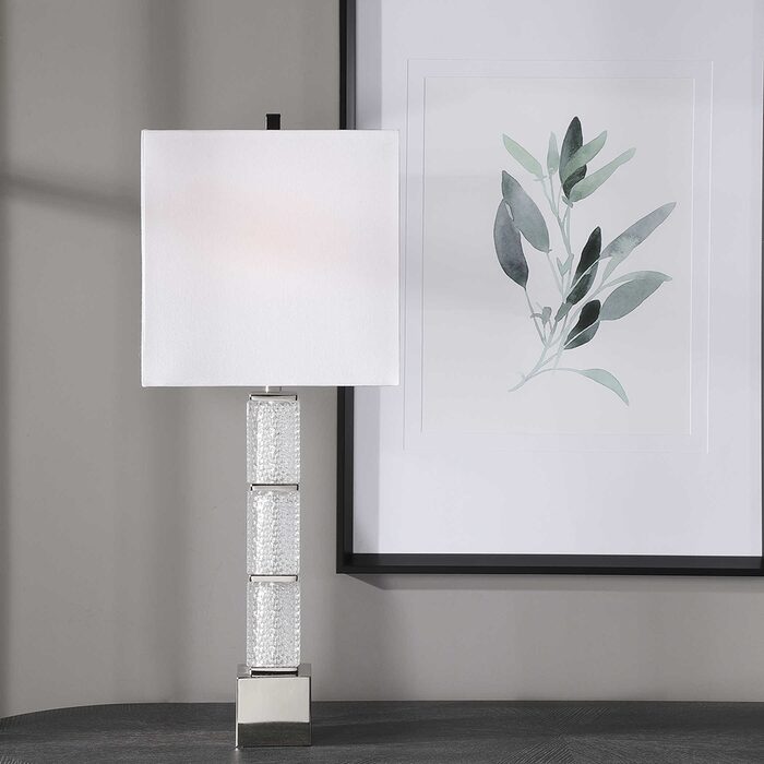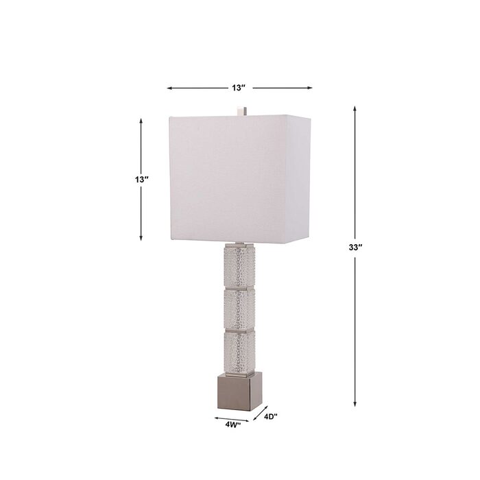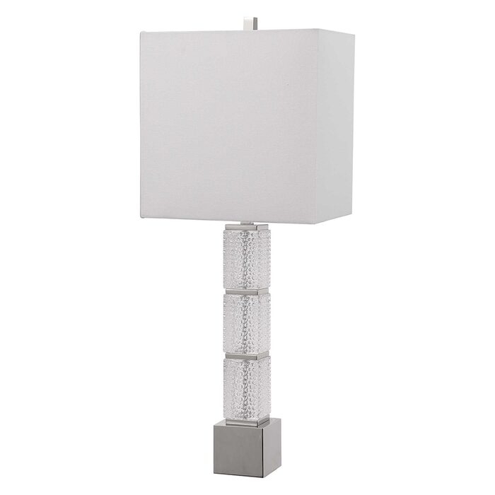 Sophisticated table lamp showcases a clear, heavily textured, dimpled glass base with sleek polished nickel plated iron accents.