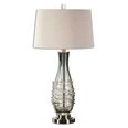 Translucent charcoal gray glass accented with a decorative layer of clear glass and plated gun metal details.