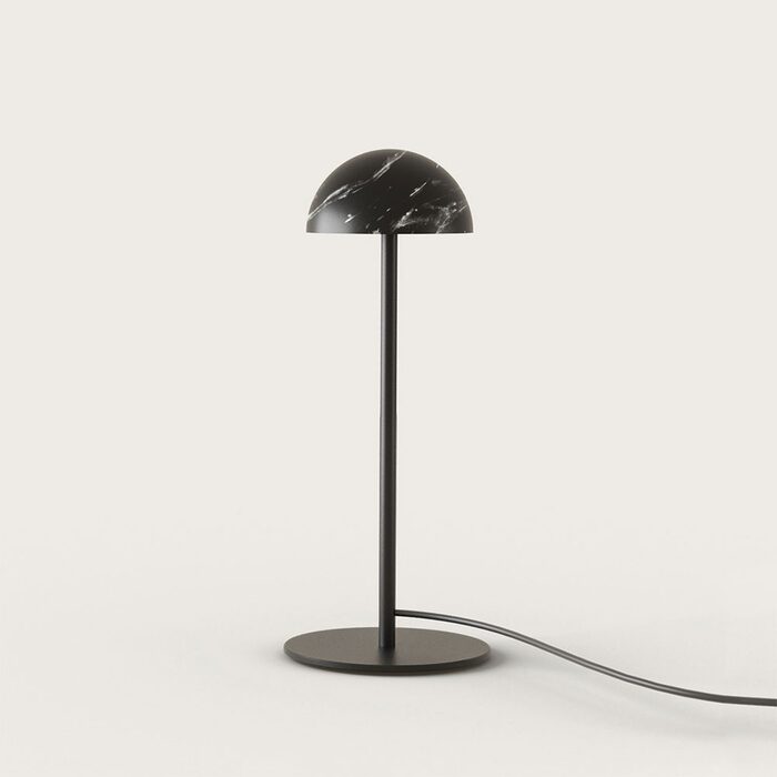 Dussa Table Lamp by Aromas Del Campo features a compact marble dome shade which sits above a slimline steel fixture and base.