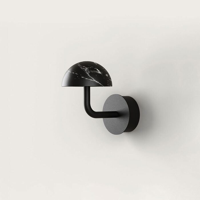 Dussa Wall Light by Aromas Del Campo features a compact marble dome shade which stems from a slimline steel arm and circular backplate.