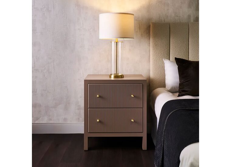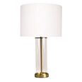 The sleek glass cylindrical base with brass accents adds a sophisticated touch, while the white drum shade exudes gentle, radiant light that brings a touch of glamour to any room.