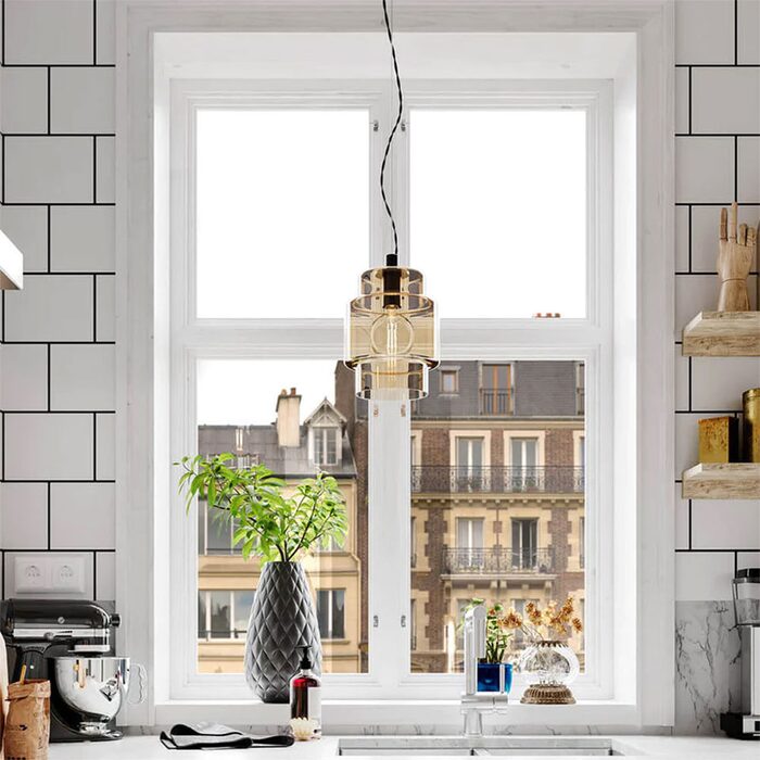 The shade made of glass has a diameter of 20 centimeters and a height of 29 centimeters. The length of the pendant light is adjustable but could be maximum 120 centimeters.