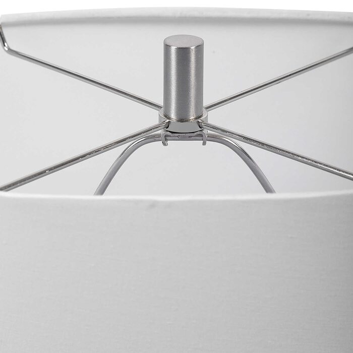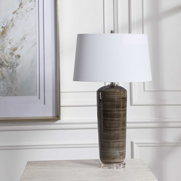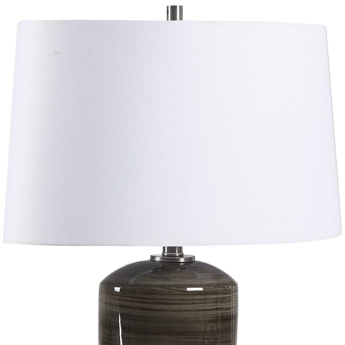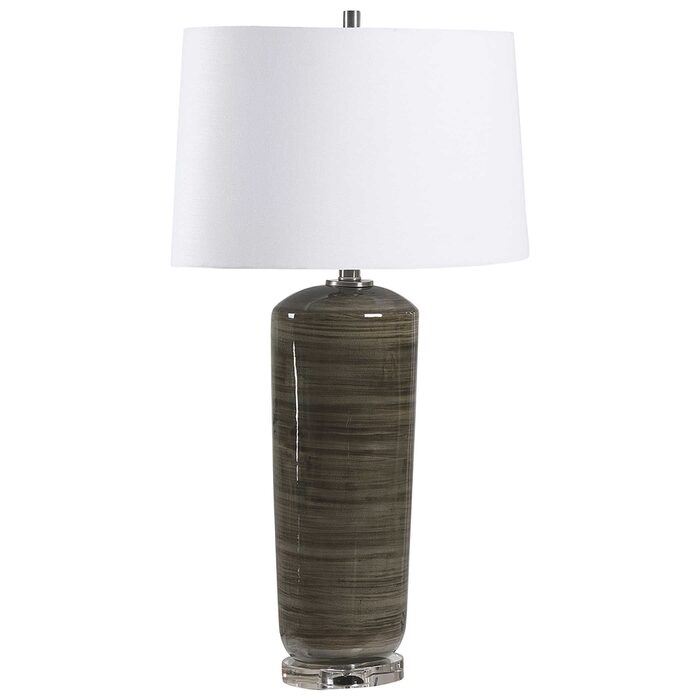 Finished in a sophisticated high gloss charcoal glaze, this ceramic table lamp features subtle stripes paired with elegant brushed nickel details and crystal accents.