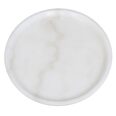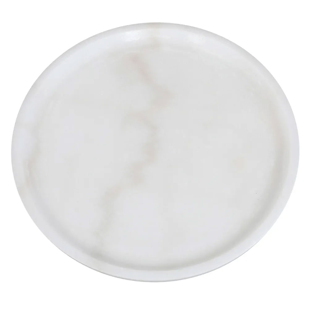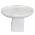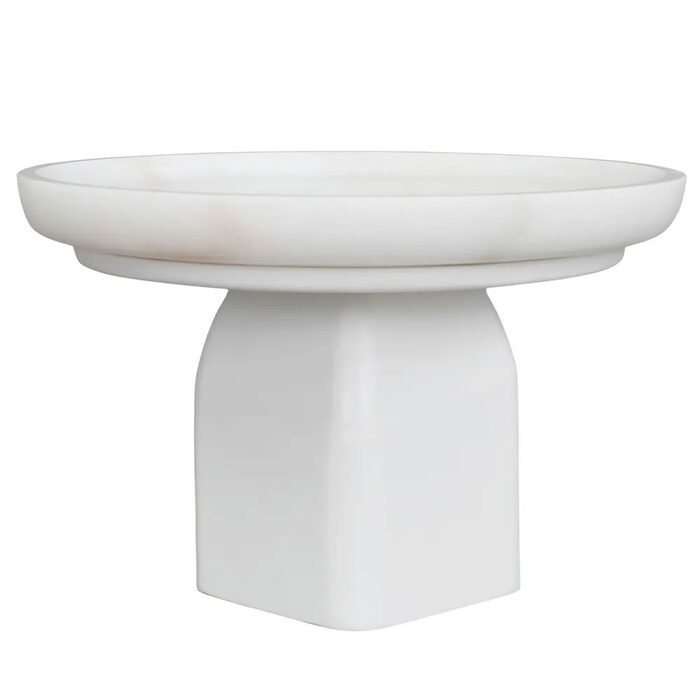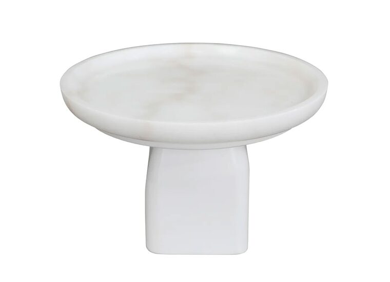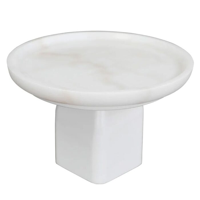 The Edith Footed Bowl in White is a sophisticated accent piece, featuring a polished white marble top and a minimalist white base.