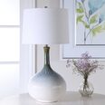 Mid-century inspired table lamp has a fluted ceramic base with noticeable ribbed texture and is finished in a cream, light blue, indigo, and dark brown ombre glaze with brushed nickel plated accents.