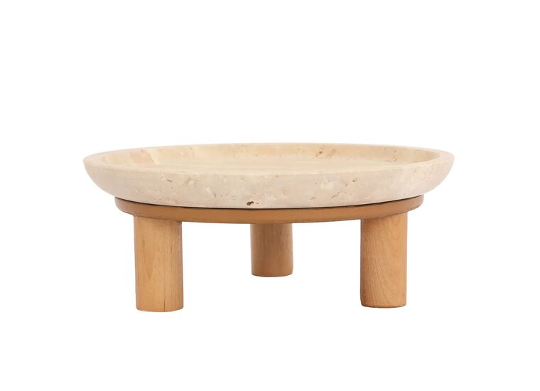 Featuring a natural travertine stone top supported by wooden legs, this bowl brings a touch of organic elegance to your home decor.