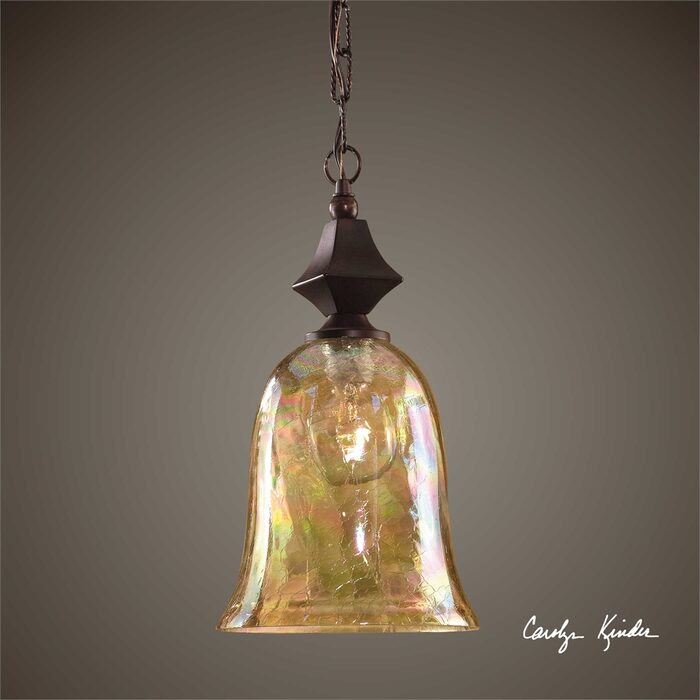 Oversized height gives elegance to our Elba pendant with the iridescent shimmer amber crackle glass with a square cap detail in our Spice finish of earthy brown with rubbed black undertones.
