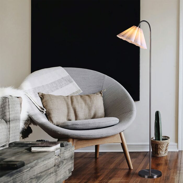 This stunning fabric floor lamp features a satin nickel finish and a white pleated shade, adding a touch of elegance and stylish personality to any room.