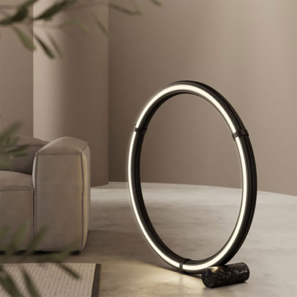 The elegance and the precious materials that characterise this beautiful sophisticated design and great style floor lamp bring an elegant and sophisticated appearance to any place. Elli LED Floor Lamp Designed by JF Sevilla for Aromas is made up of a cylindrical base in black marble, on which stands a large circular metallic shade. Available in two different colours black or gold and with LED strip technology with energy saving system. The led strip located on the external wall of the shade projects an elegant, glare-free light beam, creating a unique and welcoming atmosphere with an attractive effect thanks to the LED technology, perfect for environments like living areas, contract spaces and bedrooms.