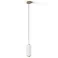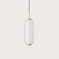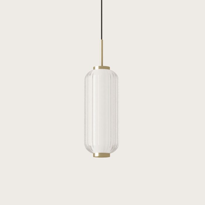 This pendant features a cylinder of transparent striped glass surrounding an opal acrylic centre with ethereal qualities.