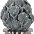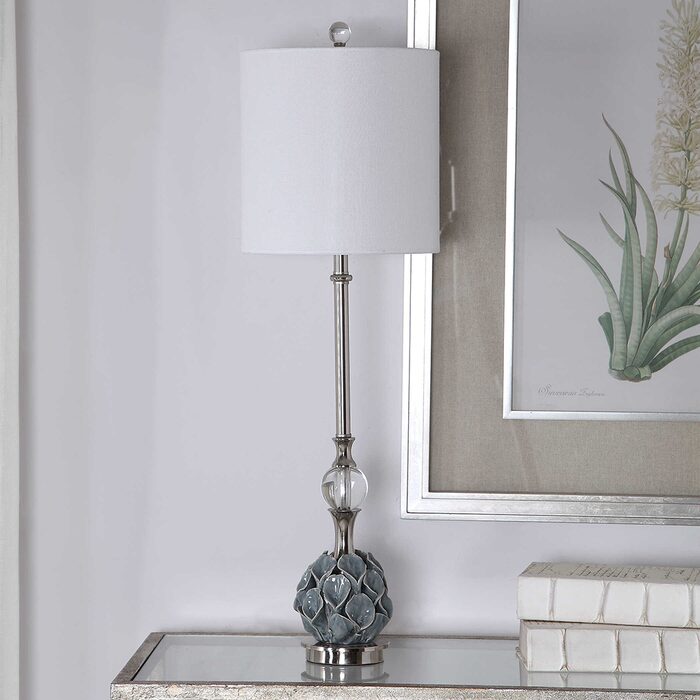 Add a touch of whimsical style to a space with this buffet lamp design by featuring a decorative ceramic calla lilies bouquet finished in a blue gray glaze, paired with crystal accents and polished nickel plated details.