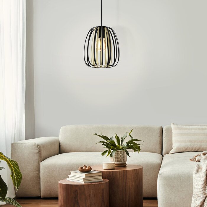 Add modern style to your home with this striking pendant light, featuring a large, caged lampshade with a sandy or black coloured steel finish and with a textile cable.