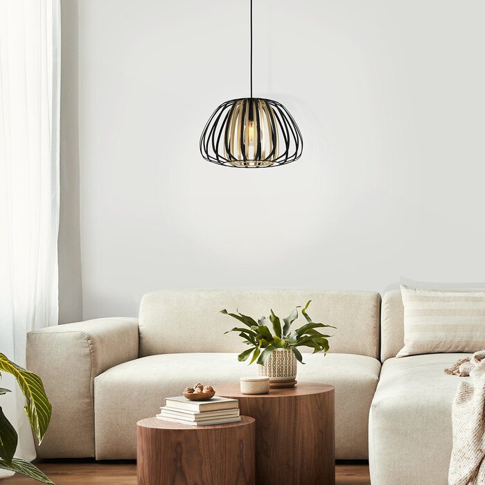 Add modern style to your home with this striking pendant light, featuring a large, caged lampshade with a sandy or black coloured steel finish and with a textile cable.