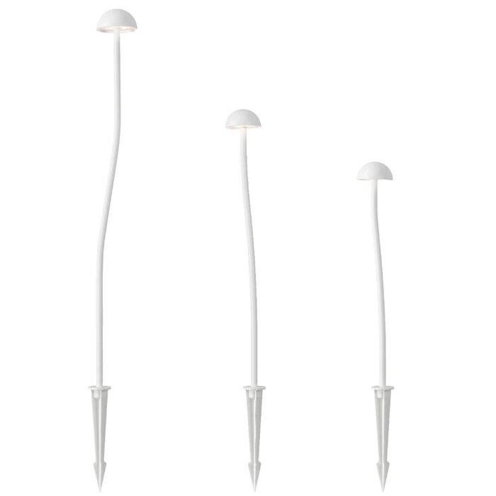 The Enoki post light set introduces a contemporary twist to outdoor lighting, featuring three curved post lights in varying heights of 40 cm, 50 cm, and 70 cm to create visual interest in garden spaces.