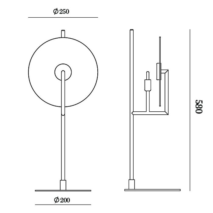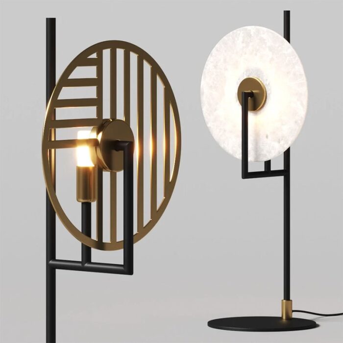The circular base ensures perfect stability for the lamp's base, a vertical tube with an elegant fork that holds the alabaster diffuser in place thanks to subtly gilded brass plates. These golden details underline the timeless elegance of this model, making it an ideal desk lamp for any contemporary interior.