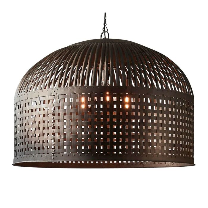 Esch features individual lengths of iron strips that are woven together and held in place by rivets, suspended beneath a graceful dome.