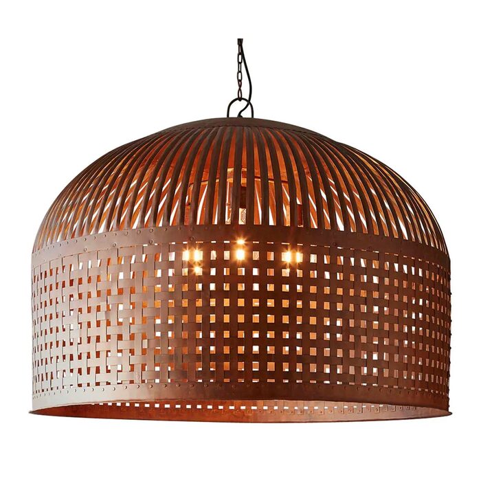 Esch features individual lengths of iron strips that are woven together and held in place by rivets, suspended beneath a graceful dome.
