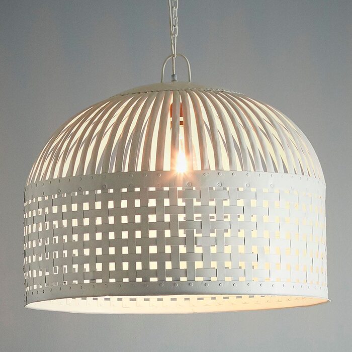 Esch features individual lengths of iron strips that are woven together and held in place by rivets, suspended beneath a graceful dome.