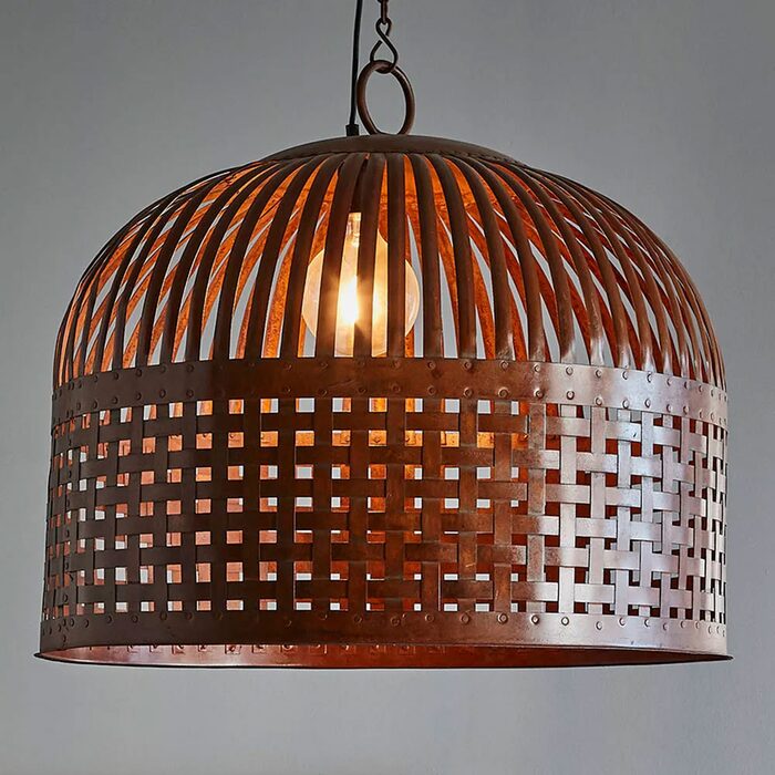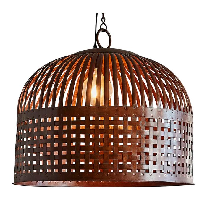 Esch features individual lengths of iron strips that are woven together and held in place by rivets, suspended beneath a graceful dome.