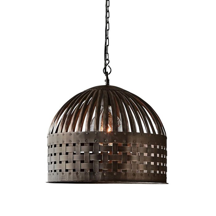 Esch features individual lengths of iron strips that are woven together and held in place by rivets, suspended beneath a graceful dome.