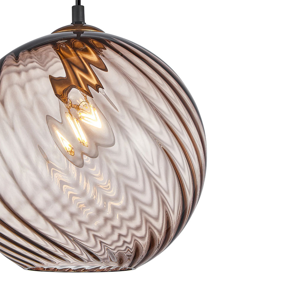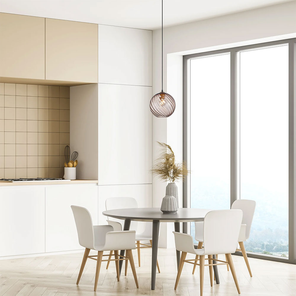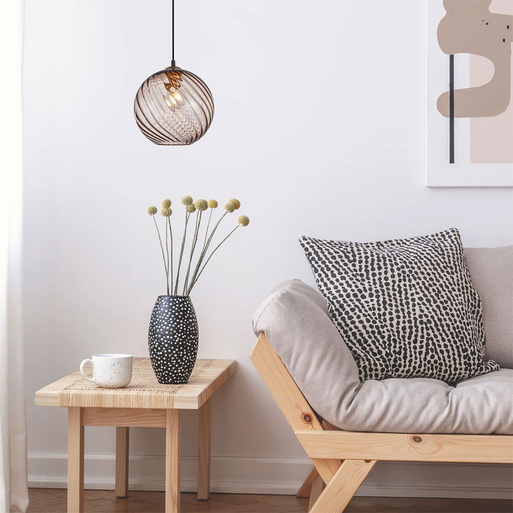 The Espiral Wine Glass Shade Pendant in Coffee by CLA Lighting features a delicate, round glass shade with a wavy finish, reminiscent of elegant wine glass contours.