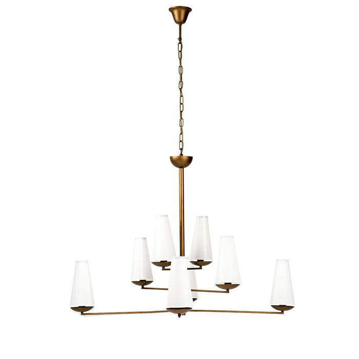 Constructed from a tubular iron frame in an elegant antique gold painted finish, the Esther chandelier measures 114cm diameter and features 8 tapered lamp shades that hover lightly above an antique gold bowl, omitting a warm, defused glow.