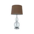 - Materials: Metal base, Clear glass stem, Linen Shade