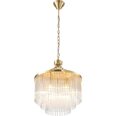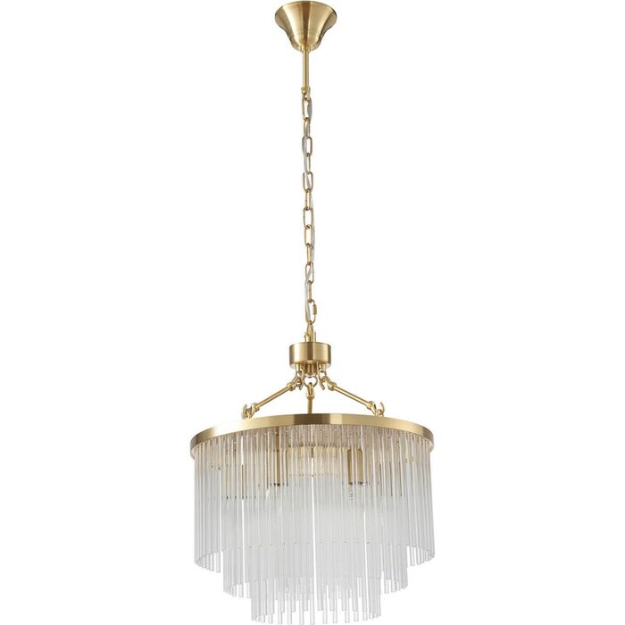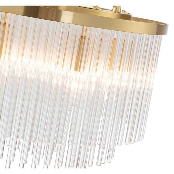 Available in three sizes and finished in a luxurious satin brass, each piece features cascading strands of clear glass rods that beautifully catch and reflect the light.