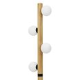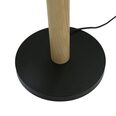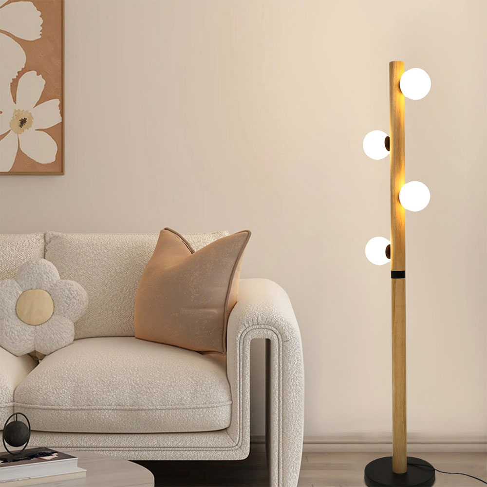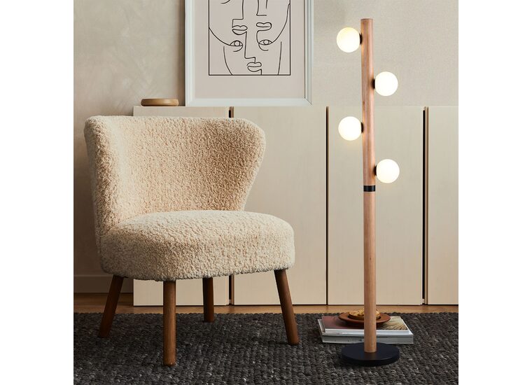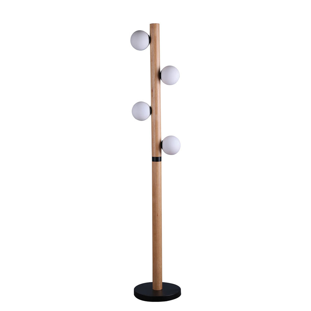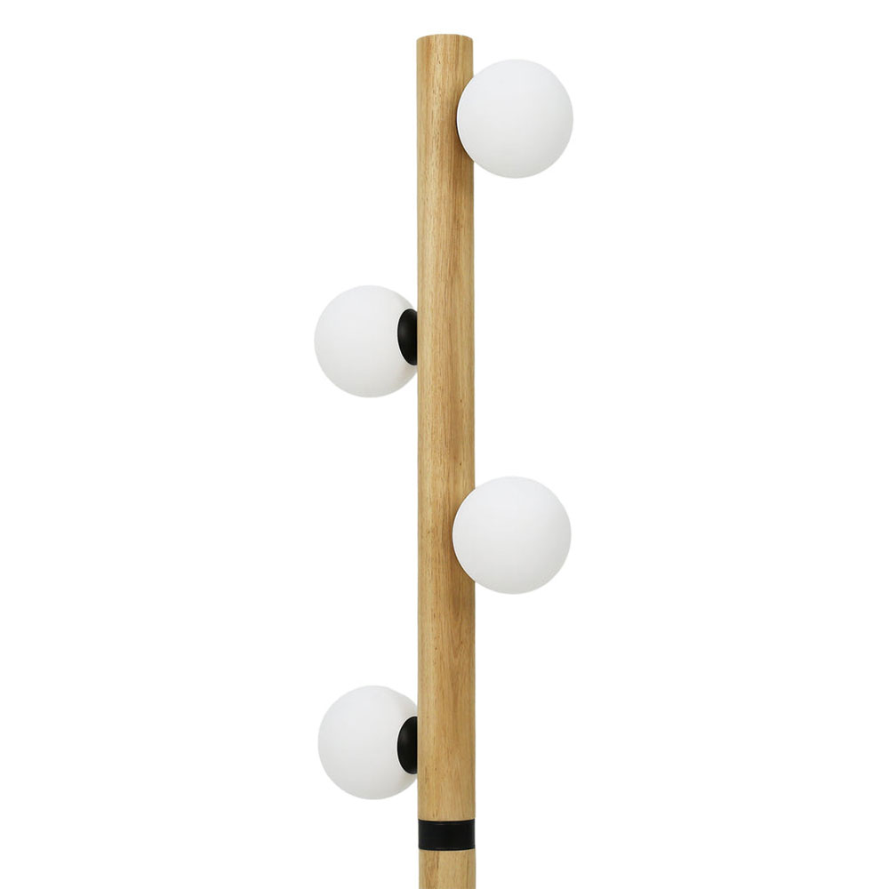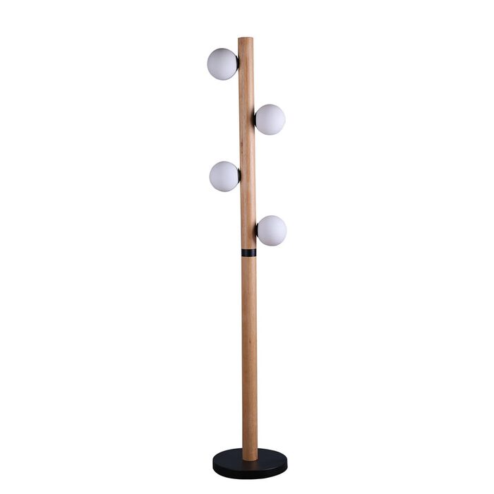 The Evie Floor Lamp blends modern elegance with functionality, featuring a sleek matte black metal base, wood grain finish stand, and sophisticated white glass shades.
