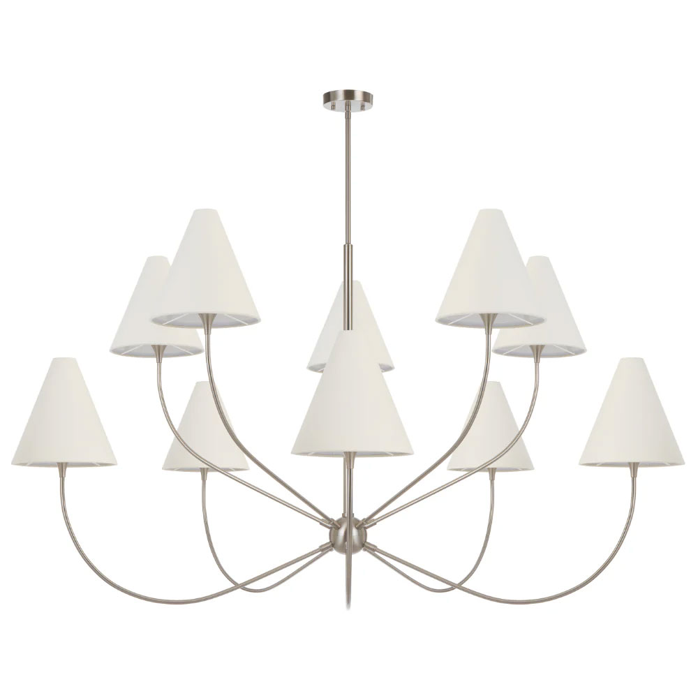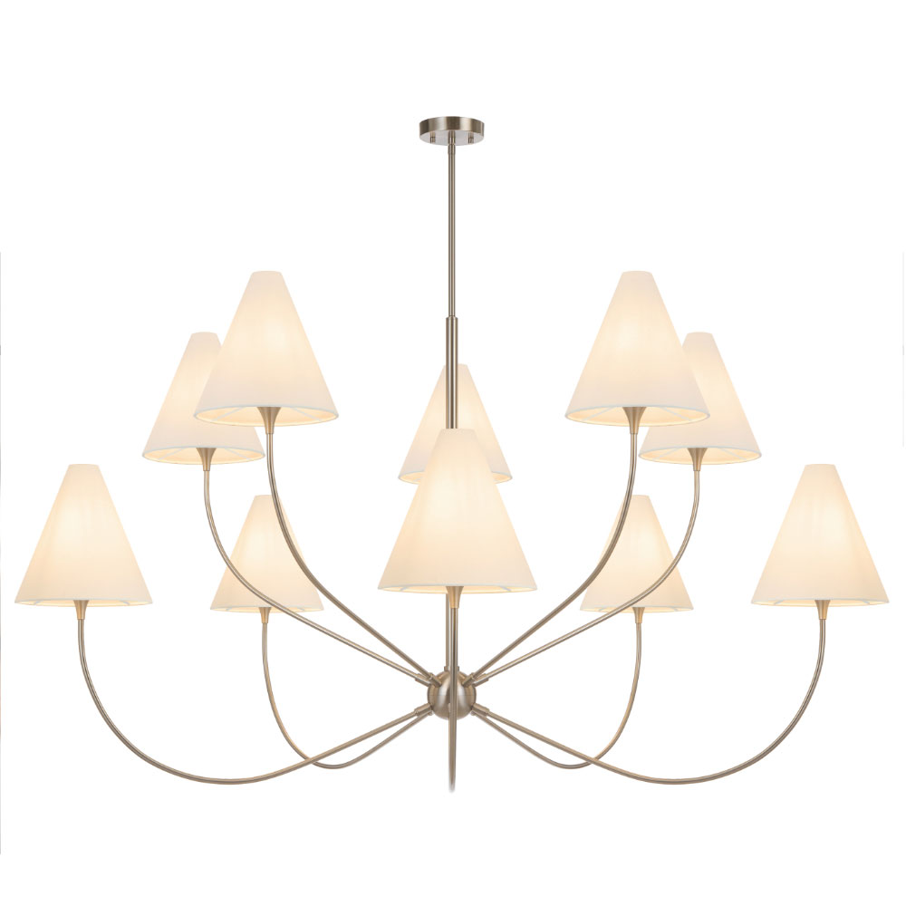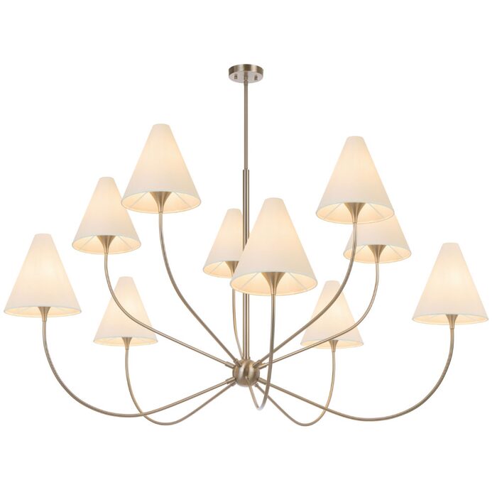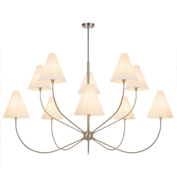 Featuring gently curved arms and tapered fabric shades, these pendants and wall lights create a soft, inviting glow.