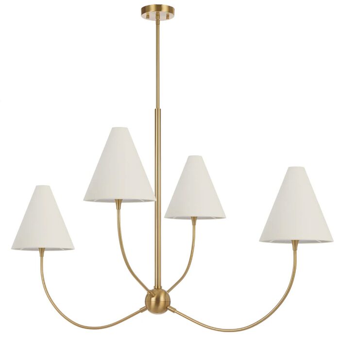 Featuring gently curved arms and tapered fabric shades, these pendants and wall lights create a soft, inviting glow.