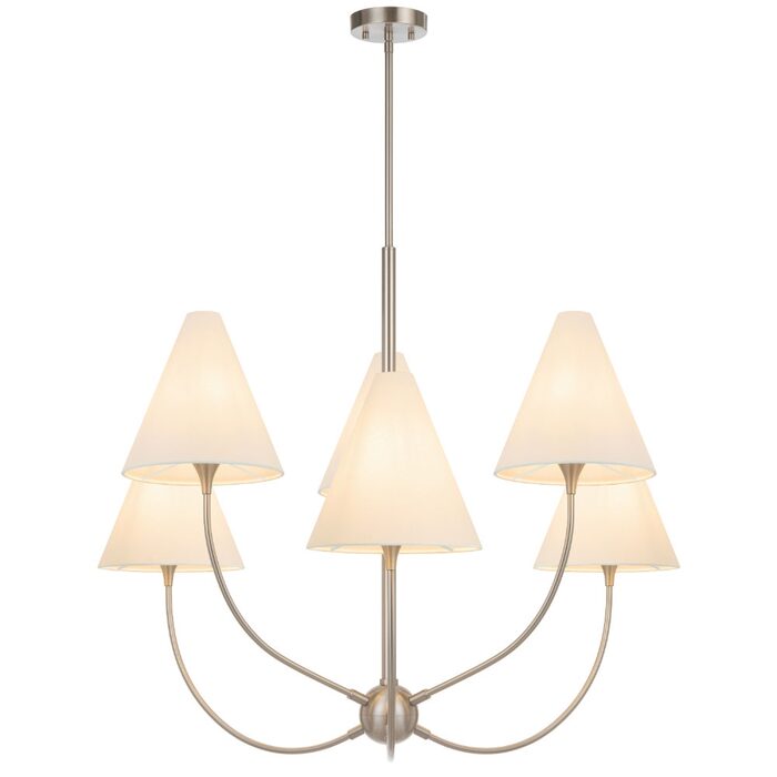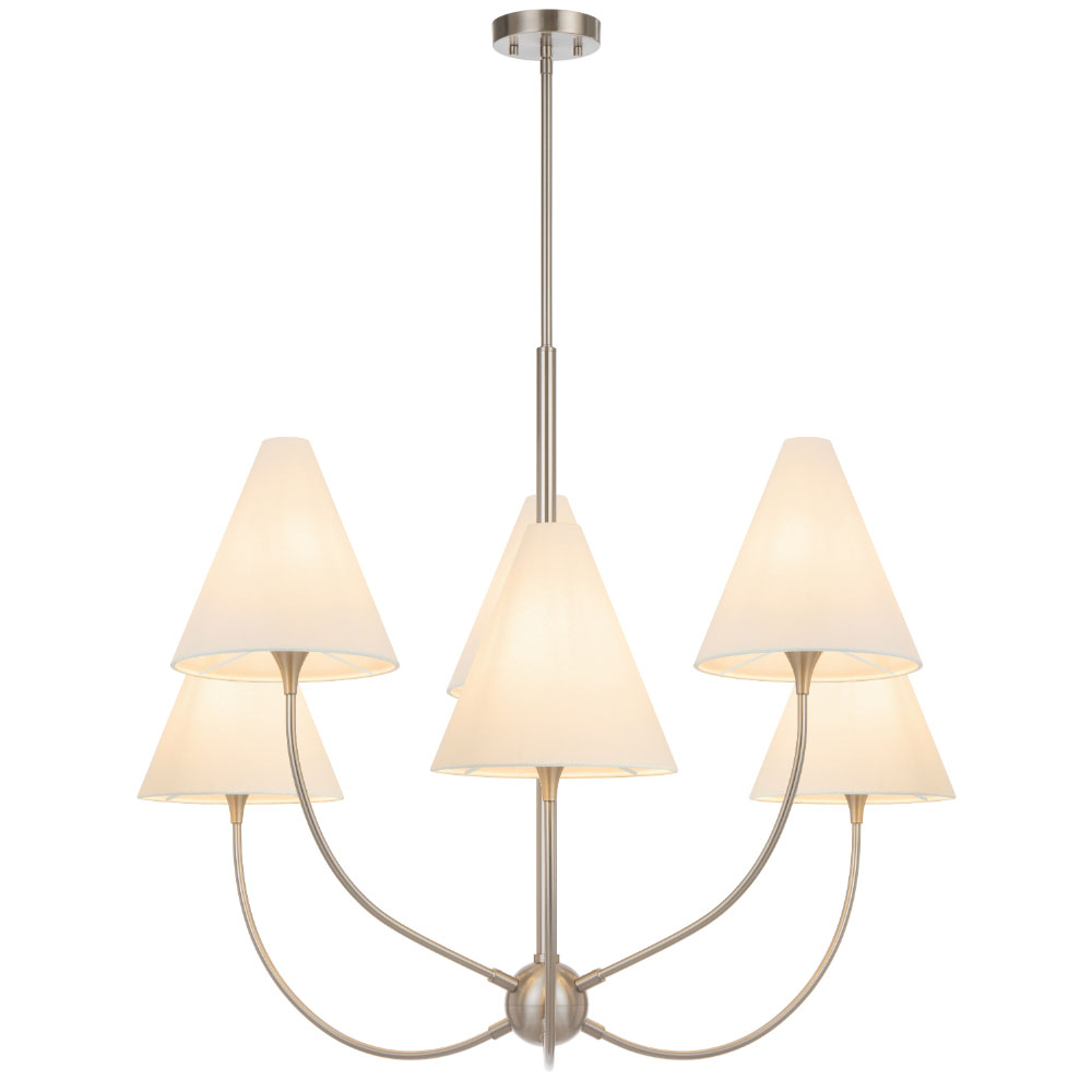 Featuring gently curved arms and tapered fabric shades, these pendants and wall lights create a soft, inviting glow.