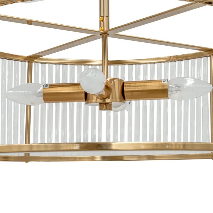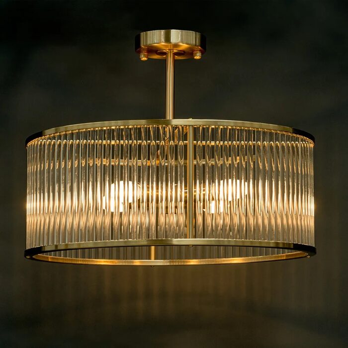 Understated luxury, the Farrah Flush Mount features a stunning rounded shade with a stylish brushed brass finished metal frame encasing a mesmerising display of cylindrical glass rods.
