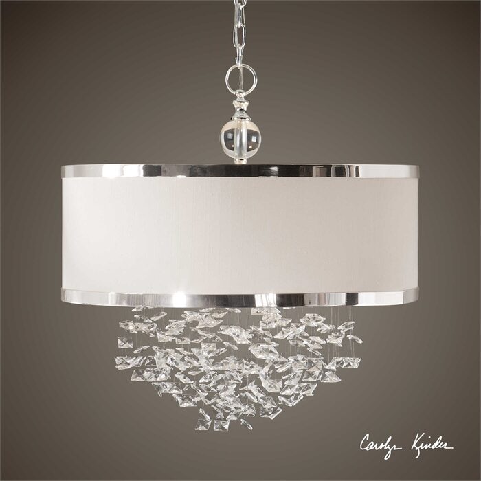 The classic appeal of crystal is updated for today's sophisticated tastes, with free falling crystals and a silver trimmed, antique-white linen, drum shade.