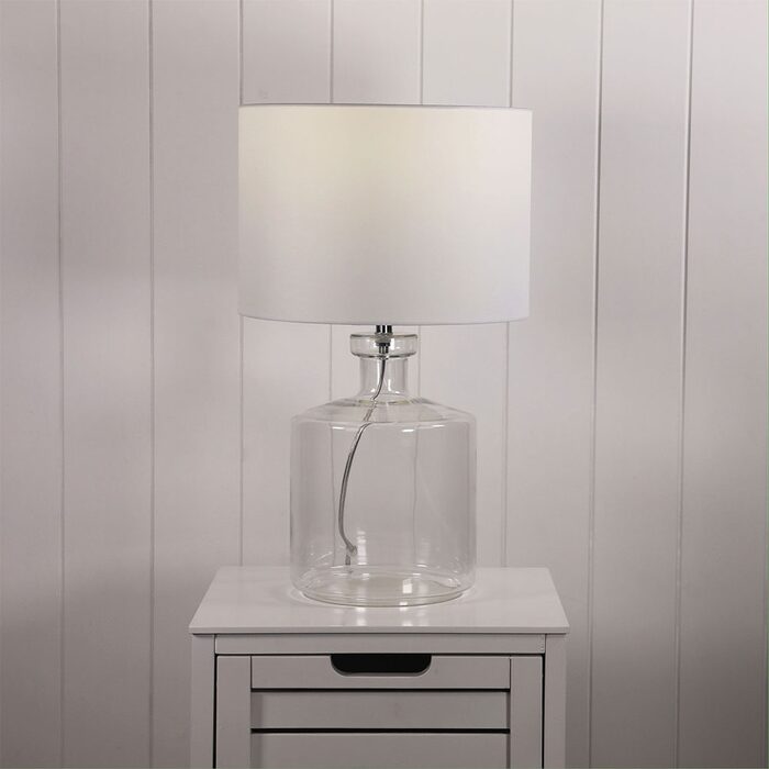 The Fermo clear glass table lamp with white cotton shade pairs perfectly with a clean modern or coastal aesthetic.