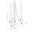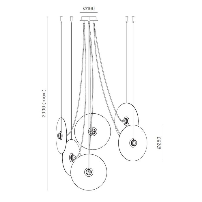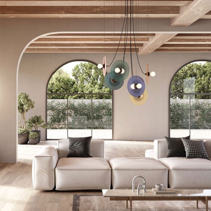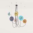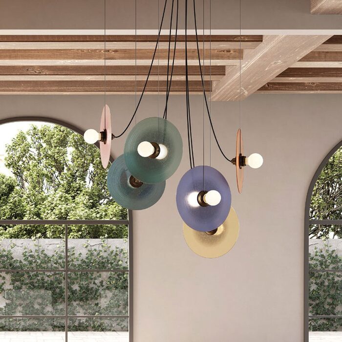 The Fest chandelier is a unique and special piece. Its 6 lights with different colored transparent glass discs and brass details, can be placed at different heights with the help of the supplied steel cable.