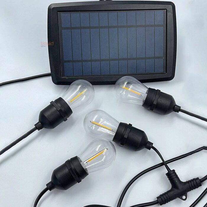 The bulbs operate on solar power, charging using sunlight (no electricity required while charging), and turn on automatically once it gets dark. On a full charge, the solar power festoon string has 6-8 hours of illumination (and 3-4 hours in the following day if the weather is overcast). 1 watt 80-lumen LED bulbs add to its cost-effective electricity consumption. If you need to charge the solar-power festoon string at night or when it’s dark, the solar panel has a USB charger input connector so you can just plug in an electric charger to have lighting while the solar panel is recharging its 2*1000ha batteries (6-8 hours to full charge).