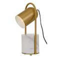 The FIDEL table lamp is the perfect accent direct light source. The marble base is saddle with a metal tube that allows the spun metal shade to pivot, directing light to your desired surface. The antique gold frame is contrasted with white marble.