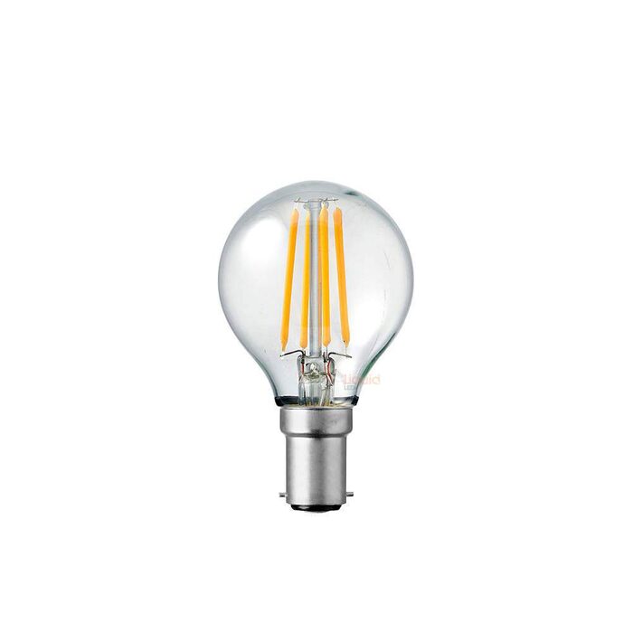 Other features of the 4-Watt Fancy Round Clear LED Filament Light Bulb (B15/ Bayonet Cap Base Configuration) include excellent full dimming compatibility with most aftermarket controllers, an average rated lifespan of more than 25,000 hours, zero UV/IR emissions, and zero presence of mercury.