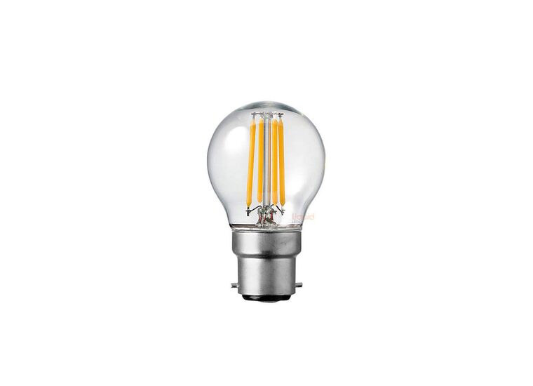 Other features of the 4-Watt Fancy Round Clear LED Filament Light Bulb (B22/Bayonet Cap Configuration) include outstanding energy efficiency, an average rated lifespan of 25,000 hours of continuous use, dimming compatibility, and low heat signatures.