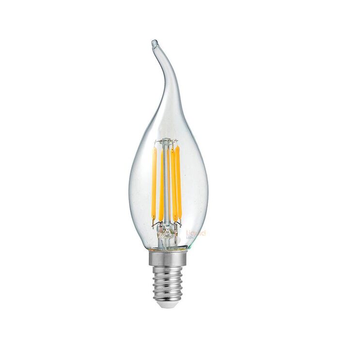 Featuring an elegant, candle-shaped profile, the 4-watt Clear Flame Tip Candle LED Filament Bulb (E14/Small Edison Screw Configuration) is the ideal lighting solution for decorative lighting situations, best used with chandeliers, wall-mounted lamps, and candelabras.