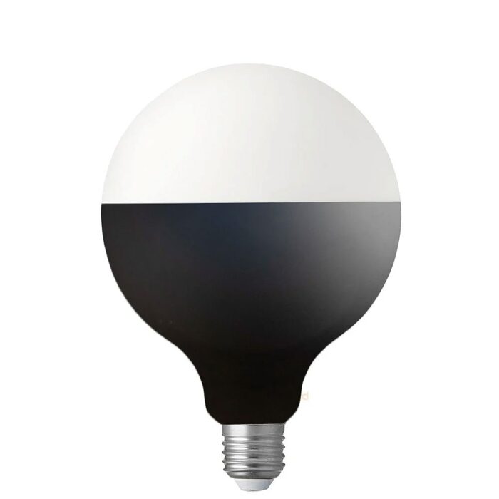 The 8W G125 Reflector Dimmable with Matte White Top 2700K LED light bulb, as its name says, is a reflector type 125mm diameter globe LED lamp. Its bottom is black while its top half (crown) is in matte white. Consequently, most of this LED bulb’s light is redirected to come out of the crown, providing more light to where the light bulb is pointed at, like a halogen light bulb.