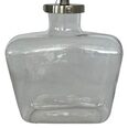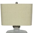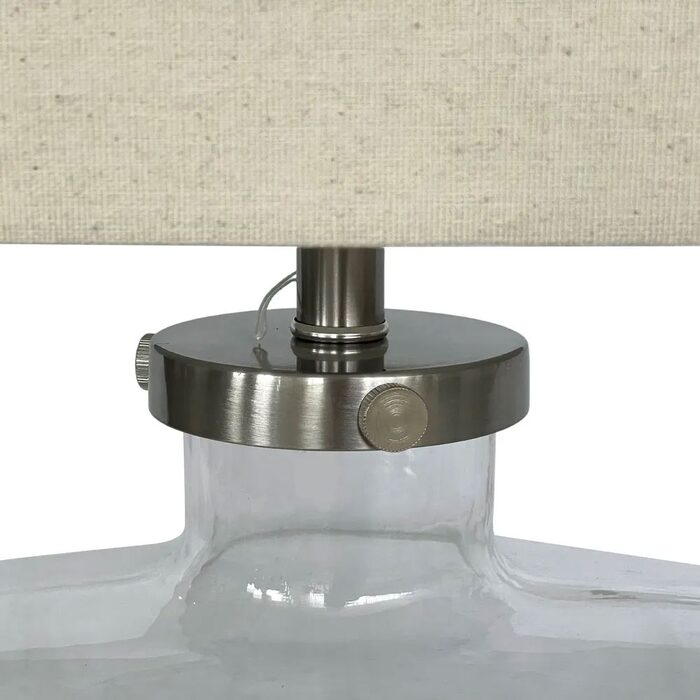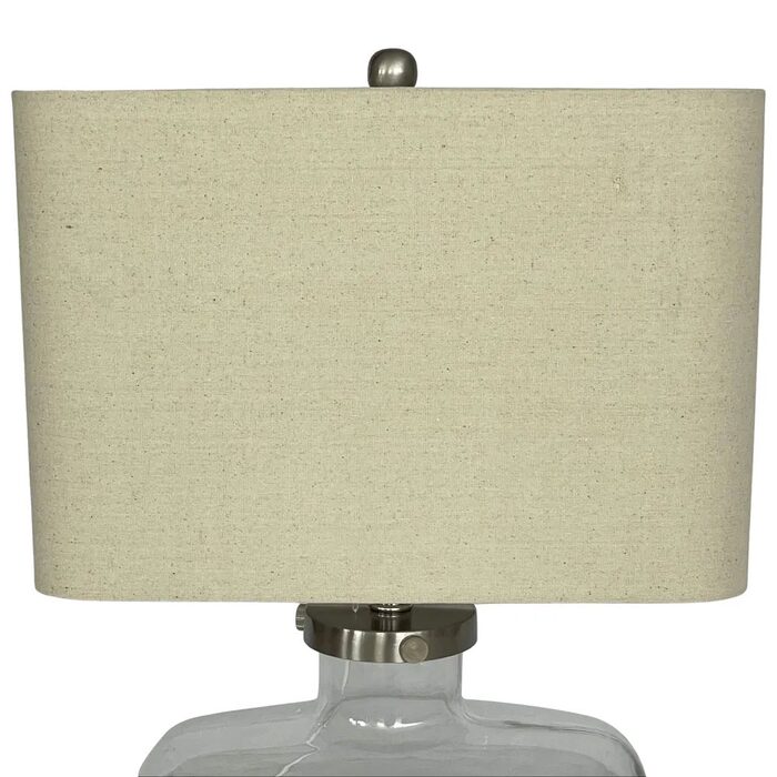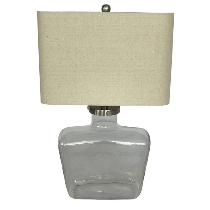 Its understated look includes a modern clear glass base with polished metal accents, and a coordinating shade.