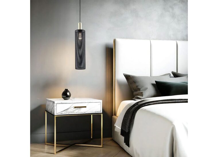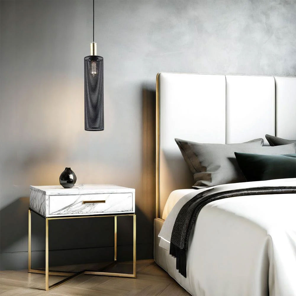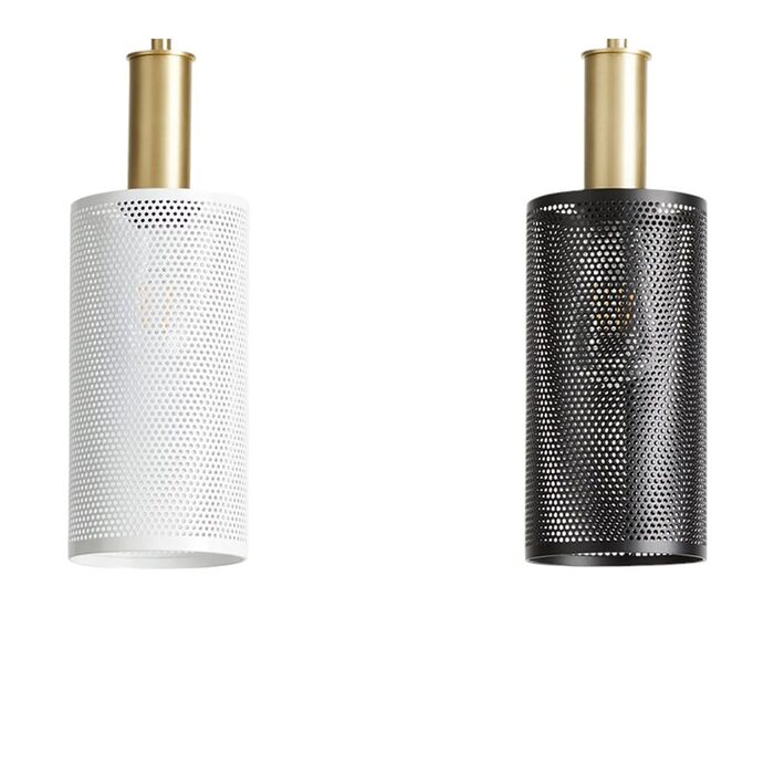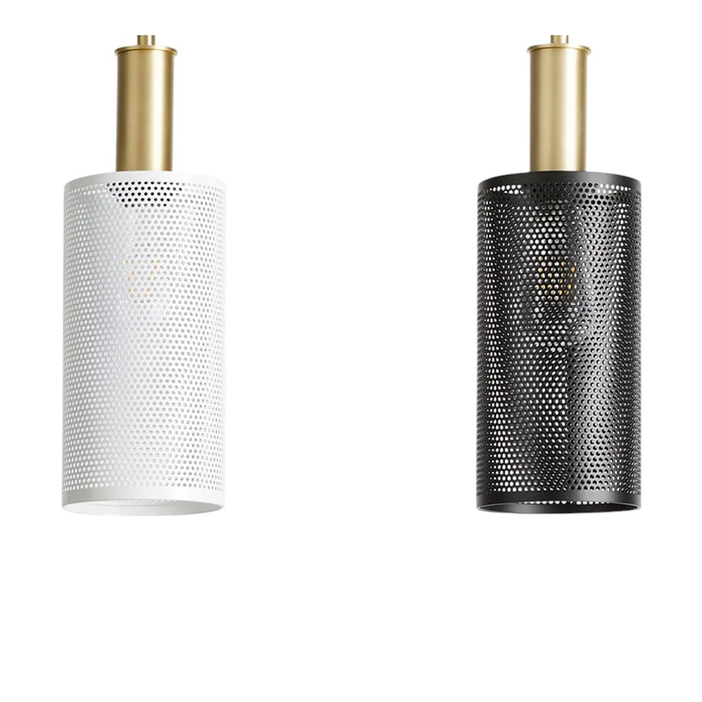 The design features matt brass details with a perforated shade, providing a unique light source.