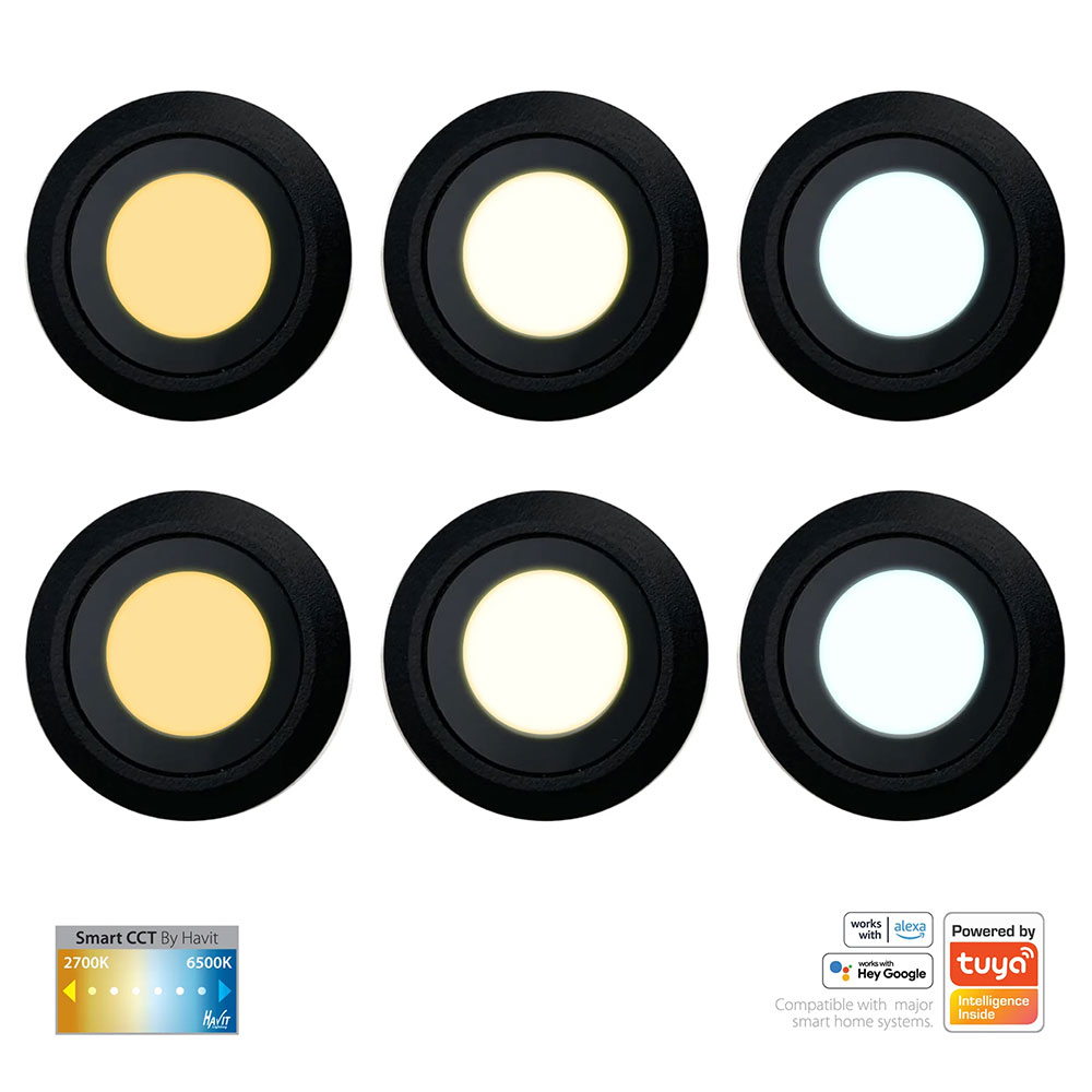 The HV2826CCT-BLK is a Havit Flame DIY CCT Smart Recessed Deck Light Kit, featuring marine-grade 316 stainless steel construction, frosted glass, and smart LED technology to change color temperature (CCT) via a remote or Tuya app.