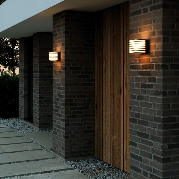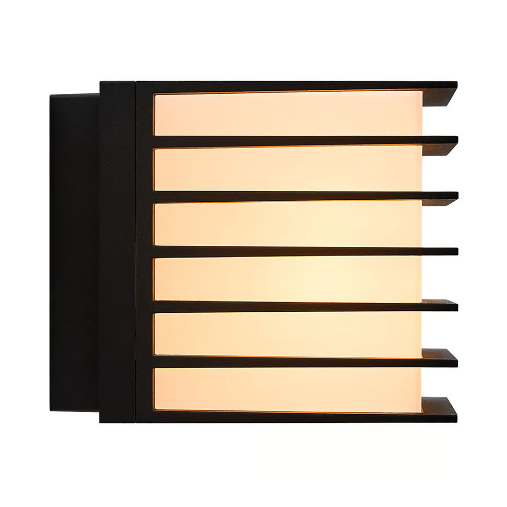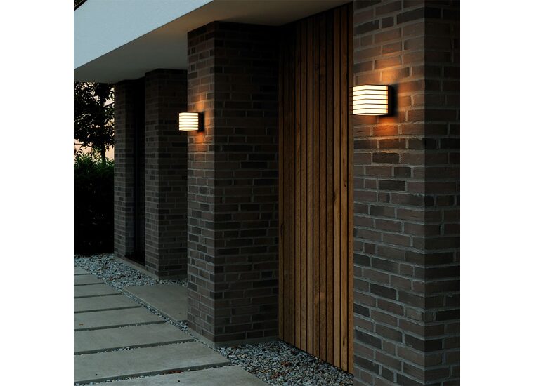 The square, streamlined design with metal slats will complement most contemporary homes and provide a soft, diffused light next to the front door, terrace or garage.