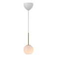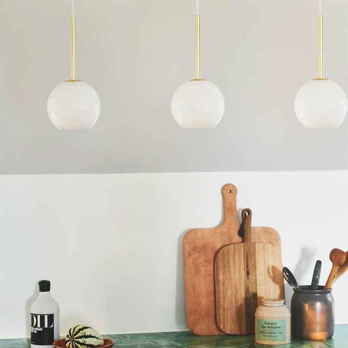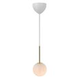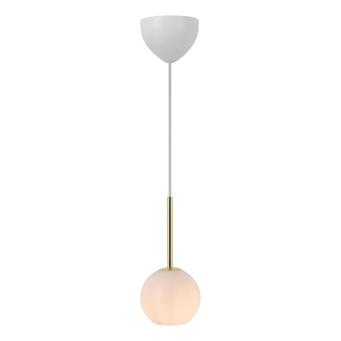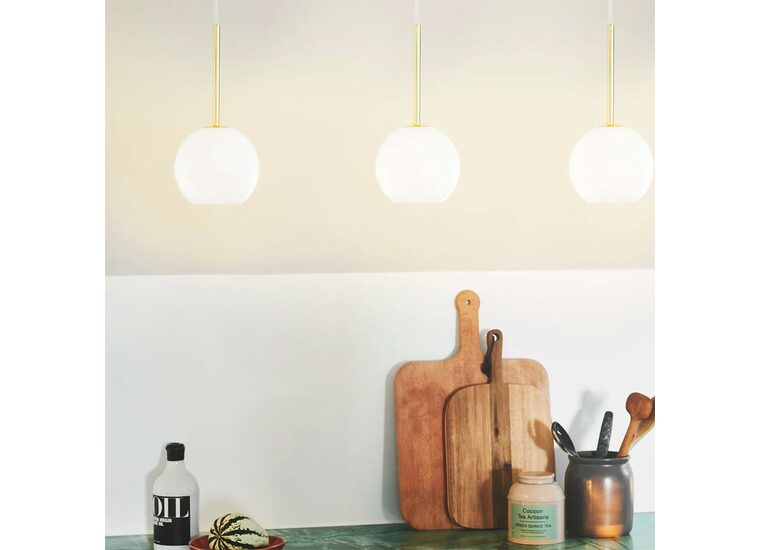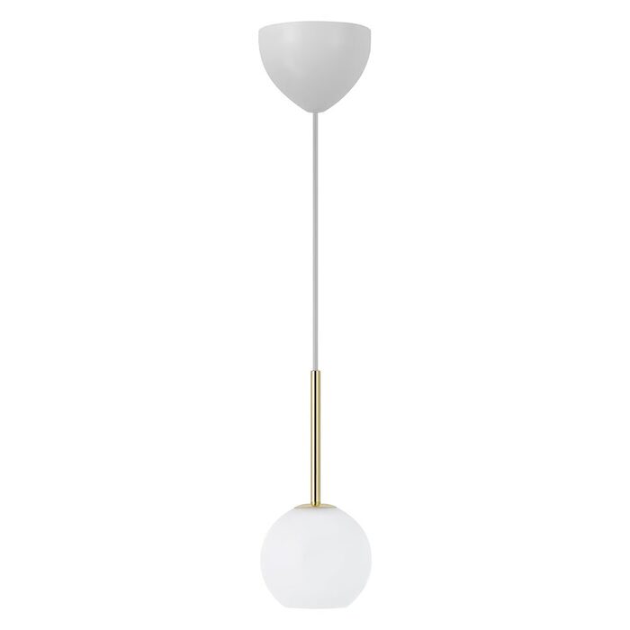 The white glass dome creates a soft and diffused light and is perfect on its own or in a cluster of several pendants at different heights.