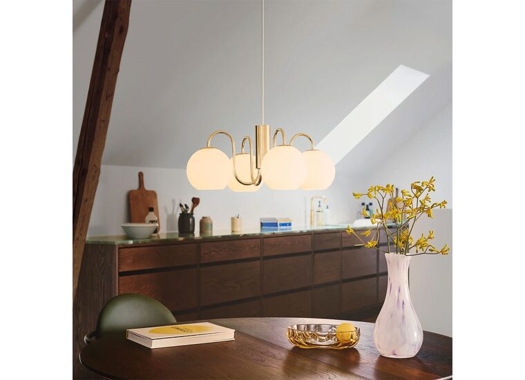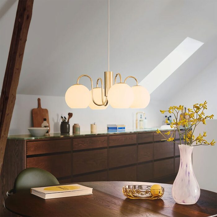 The pendant draws inspiration from the classic chandelier and incorporates vintage details with a modern twist.