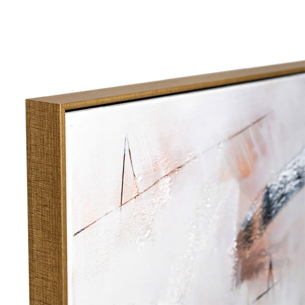 A beautifully balanced composition, Freeform oil on canvas is hand painted by skilled artists in oil and mounted in a chic antique gold shadow box frame.