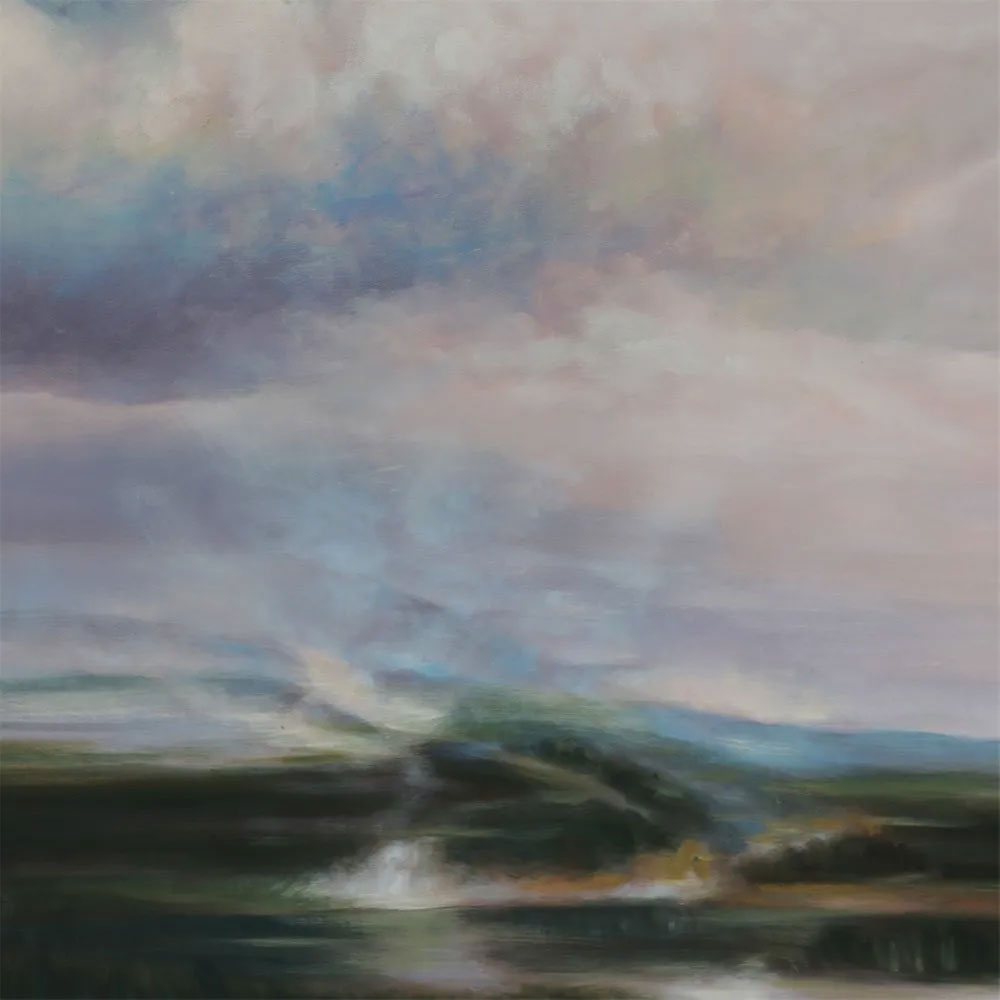 This ethereal abstract landscape painting, an exquisite oil on canvas, captures a serene marsh under a dreamy sky, blending soft blues, whites, and greens in an impressionist style.